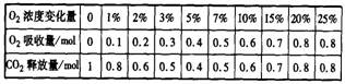 O2浓度不同的密闭容器中,lh后测定O2的吸收量和CO2的释放量,如表: