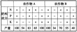 下表为关于农作物A、B在相同土壤中N、P、K三要素肥效实验的结果记录(“十”表示施肥,“-”表示未施肥)。据此结果得出的正确结论是