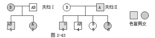 IA、IB和i三个等位基因控制ABO血型系统。X染色体上的一个隐性基因能够引起色盲。请分析下面的家谱:( )