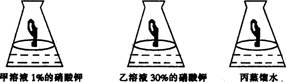 16.通过植物组织培养得三株同一植物的等大幼苗甲、乙、丙.将它们放在图示的三种条件下培养3 h后,植株表现得硬挺的是 ( )