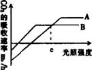 19.如右图所示,两曲线分别表示阳生植物和阴生植物CO2吸收量随光强变化的情况.请据图回答问题,当光照强度为c时,比较两植物的有机物积累速率A1、B1以及两植物有机物合成速率A2、B2,比较结果分别为 ( )