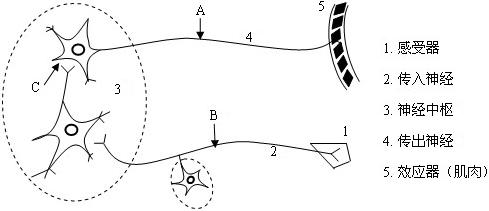 26、2006年普通高等学校招生全国统一考试(天津卷)某种药物可以阻断蟾蜍屈肌反射活动。下图为该反射弧的模式图。A、B为神经纤维上的实验位点,C为突触间隙。下列实验结果中,能够证明这种药物“在神经系统中仅对神经细胞间的兴奋传递有阻断作用”的是( )