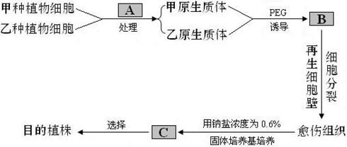 (6)通过细胞工程技术,利用甲、乙两种植物的各自优势,培育高产耐盐的杂种植株。请完善下列实验流程并回答问题: