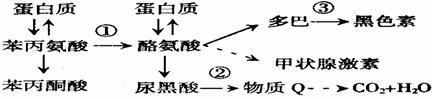 37.(7分)下图所示人体内苯丙氨酸与酪氨酸的代谢途径,图中的数字分别代表三种酶。