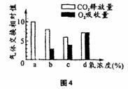 14.图4表示某绿色植物的非绿色器官在氧浓度为a、b、c、d时,CO2释放量和O2吸收量的变化。下列相关的叙述正确的是 ( )