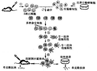 (2)步骤③是指B淋巴细胞和骨髓瘤细胞在 的诱导下融合,然后放在多孔培养板上培养。在多孔培养板中生长的细胞共有 种类型。