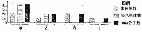 22.下图中甲-丁为某动物(体细胞染色体数=2n)睾丸中细胞分裂不同时期的染色体数、染色单体数和DNA分子数的比例图,关于此图叙述中错误的是 ( )
