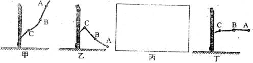 (2)弯曲并绑扎固定甲、乙、丙、丁4根枝条,分别使A、B、C三个芽留取在枝条上显示出某种“顶端”的含义;其中甲、乙、丁的姿态如图所示,试在方框内画出丙枝条的姿态并标出A、B、C三个芽的位置。