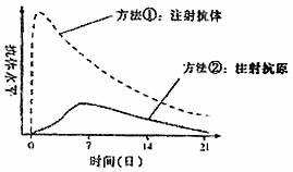 44.(6分)下图中的曲线显示了两种使人体获得免疫力的方法。两种方法均在第0天将某种物质注射进人体。请据此分析回答下列问题: