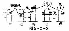 9.如图6-2-5所示,甲、乙分别用不透光的锡箔纸套在燕麦胚芽鞘的不同部位,丙、丁、戊则分别用不透水的云母片插入燕麦胚芽鞘的不同部位,从不同方向照光,培养一段时间后,胚芽鞘的生长情况是 ( )