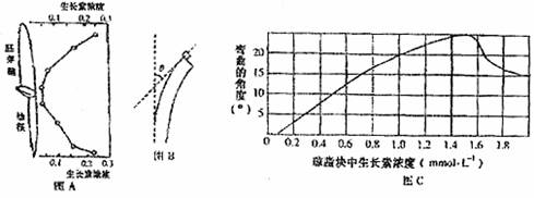 (4)切除玉米胚芽鞘的顶端,然后在其左侧放置含有不同浓度生长素的琼脂块,保持在黑暗中12h。胚芽鞘可能向右弯曲,弯曲角度如图B所示。