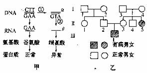 43.如图甲表示人类镰刀型细胞贫血症的病因,乙是在一个家庭中该病的遗传系谱图(控制基因B、b)。已知谷氨酸的密码是GAA,GAG,请根据图回答下列问题: