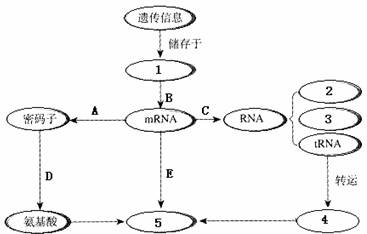 46.如下图是基因的表达的相关概念图,请在圆圈内写出1、2、3、4、5所代表的物质的名称,箭头上方的A、B、C、D、E写出“关联词”。