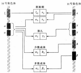 47.控制人的血红蛋白基因分别位于人的11号、16号染色体上,在不同的发育时期至少有αβγεδ和ζ基因为之编码。人的血红蛋白由四条肽链组成,在人的不同发育时期血红蛋白分子的组成是不相同的。例如人的胚胎血红蛋白由两个ζ肽链(用ζ2表示)和两个ε肽链(用ε2表示)组成。下图为基因控制蛋白质合成的示意图。