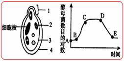 54.(7分)左下图为酵母菌细胞的模式图和生长曲线,右下图为从其生产酒精的发酵罐中五次取样的结果。请回答: