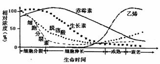 28.中国科学院的植物生理学家研究了几种果实发育、成熟和衰老过程中的激素变化,并绘制出了下图。对此图的相关描述中不合理的是 ( )