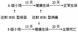 32.科学家初步研制出H5N1型禽流感疫苗,应用前必须进行动物实验检测其效果,将未感染H5N1型病毒的一群健康小鸡分为A、B两组,实验过程和结果如下图所示: