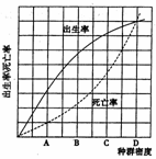 34.科研人员对海洋某种食用生物进行研究,得出了与种群密度相关的出生率和死亡率的变化,如下图所示。下列对此图的分析不正确的是 ( )