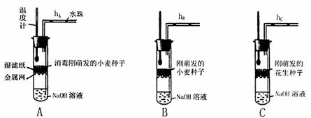 (6)在下图密闭装置中,分别放入质量相等的消毒且刚萌发的小麦种子、刚萌发的小麦种子及刚萌发的花生种子,把三套装置放在隔热的且适宜条件下培养,A与B玻璃管中的水珠开始移动时的速率分别为vA和vB,则vA vB(填>、<、=);如果B和C中都消耗了等质量的有机物,温度计读数为TC TB(填>、<、=)