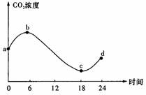 9.某校生物学习兴趣小组在玻璃温室里进行植物栽培实验,为此他们对室内空气中的CO2含量进行了24小时测定,并根据数据绘制了如右图所示的曲线。请问图中表示光合速率等于呼吸速率的点是 ( )