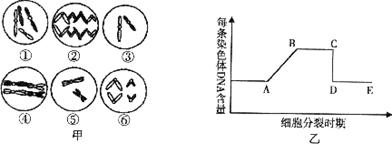 43.(9分)甲图中①表示某二倍体高等雌性动物体细胞染色体示意图,②一⑥是①的各分裂期图;乙图表示细胞分裂的不同时期与每条染色体DNA含量变化的关系。请分析回答: