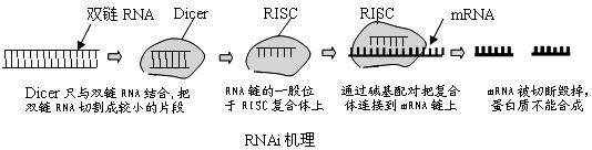 菲尔和梅洛因发现了RNA干扰现象(RNAi),获得了2006年诺贝尔生理学或医学奖。RNA干扰的机制如下:双链RNA一旦进入细胞内就会被一个称为Dicer的特定的酶切割成21-23个核苷酸长的小分子干涉RNA(SiRNA)。Dicer能特异识别双链RNA,以ATP依赖方式切割由外源导入或者由转基因、病毒感染等各种方式引入的双链RNA,切割产生的SiRNA片断与一系列酶结合组成诱导沉默复合体(RISC)。激活的RISC通过碱基配对结合到与SiRNA同源的mRNA上,并切割该mRNA,造成蛋白质无法合成(如下图所示)。请分析回答下列问题: