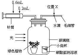 下图是探究绿色植物光合作用速率的实验示意图,装置中的碳酸氢钠溶液可维持瓶内的二氧化碳浓度。该装置放在20℃环境中。实验开始时,针筒的读数是0.2mL,毛细管内的水滴在位置X。30分钟后,针筒的容量需要调至0.6mL的读数,才能使水滴仍维持在X的位置。据此回答下列问题: