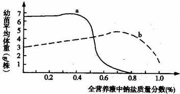 现有两种同科不同属的农作物,甲高产不耐盐,乙低产耐盐。将等量的甲、乙种子(发芽率相同)分别种在含有不同浓度钠盐的培养液中,并用珍珠沙通气、吸水和固定种子。种子萌发一段时间后,测定幼苗平均重量,结果如下图。请回答下列问题: