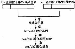 27.(17分)在正常人体细胞中,非受体型酷氨酸蛋白结合酶基因ab1位于9号染色体上,表达量极低,不会诱发癌变。在慢性骨髓瘤病人细胞中,9号染色体长臂未端的ab1基因断裂,与22号染色体长臂未端bcr基因发生融合,形成费城染色体。发生重排后基因内部结构不受影响,但表达量大为提高,导致细胞分裂失控,发生癌变。下图表示这种细胞癌变的机理,据图回答: