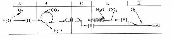 (1)在A-E的过程中,表示光合作用的是 ,表示细胞呼吸的是 。发生在细胞器中的是 阶段;能产生ATP的是 阶段;释放能量最多的是 。需要酶来催化的阶段是 。必须在光下进行的是 。(用A-E字母表示)