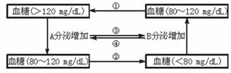 (3)当由于①使血糖含量上升时,A________的分泌会增加,通过________作用,使血糖含量恢复至正常水平。当由于②使血糖含量降低时,B_____________的分泌增加,主要通过促进________,使血糖恢复至正常水平。