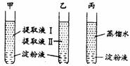 3.将小麦种子分别置于20℃和30℃培养箱中培养4天,依次取等量的萌发种子分别制成提取液Ⅰ和提取液Ⅱ。取三支试管甲、乙、丙,分别加入等量的淀粉液,然后按下图加入等量的提取液和蒸馏水,45℃水浴保温5分钟后,立即在3支试管中加入等量斐林试剂,并煮沸2分钟,然后摇匀观察试管中的颜色。结果是 ( )