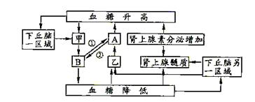 ⑶促进甲细胞兴奋而分泌B激素的因素包括胰高血糖素的分泌增加, , 。