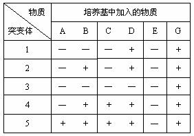 (3)现有5种酵母菌的营养缺陷型菌株1、2、3、4、5,它们不能合成生长所必需的物质G,已知A、B、C、D、E都是合成G物质的必需中间产物,但不知这些物质合成的顺序,于是在培养基中分别加入这几种物质并分析了这几种物质对各种营养缺陷型菌株生长的影响。结果下右表所示。(+:表示生长 -:表示不生长)
