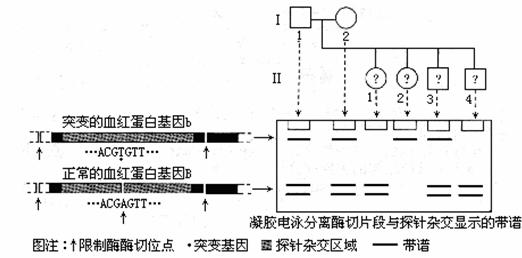 (1)从图中可见,该基因突变是由于 引起的。巧合的是,这个位点的突变使得原来正常基因的限制酶切割位点丢失。正常基因该区域上有3个酶切位点,突变基因上只有2个酶切位点,经限制酶切割后,凝胶电泳分离酶切片段,与探针杂交后可显示出不同的带谱,正常基因显示2条,突变基因显示 条。