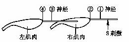 II.肌肉受到刺激会产生收缩,肌肉受刺激前后肌细胞膜内外的电位变化和神经纤维的电位变化一样。现取两个新鲜的神经-肌肉标本,将左侧标本的神经搭在右侧标本的肌肉上,此时神经纤维与肌肉细胞相连接(实验期间用生理盐水湿润标本),如图所示。图中②、④指的是神经纤维与肌细胞之间的接头,此接头与突触结构类似。刺激①可引起右肌肉收缩,左肌肉也随之收缩。请回答: