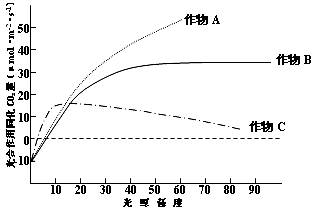 30.(20分)联合国粮农组织在2007年12月表示,有37个国家面临粮食危机、寻求帮助,国际粮食价格升高已经引发一些国家食品危机。我国官员和学者们表示,2003年和今年的迹象表明,中国的粮食产量正在下降,而长期需求呈上升态势。为此,中国国家主席胡锦涛已责成有关部门对粮食安全进行紧急研究。下图是我国北方某地区三种作物(其中有一种为C4植物)光照强度与光合速率关系图。据图回答有关问题。