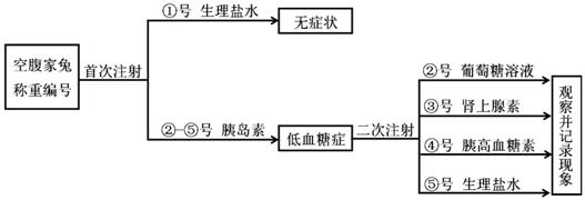 43.(每空2分,共10分)为探究血糖调节的影响因素,设计如下实验流程。实验中5只家兔的注射剂量和生理指标匀按单位体重计算。请根据下图回答下列问题: