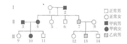 (3)假如Ⅲ一l0和Ⅲ一13结婚,生育的孩子患甲病的概率是 ,患乙病的概率是 ,不患病的概率是 。