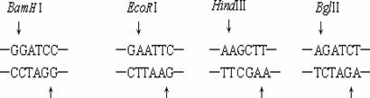 5.限制酶是一种核酸切割酶,可辨识并切割DNA分子上特定的核苷酸碱基序列。下图为四种限制酶BamHI,EcoRI,HindⅢ以及BglⅡ的辨识序列。箭头表示每一种限制酶的特定切割部位,其中哪两种限制酶所切割出来的DNA片段末端可以互补黏合?其正确的末端互补序列为何?( )