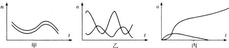 18.下图中,甲、乙、丙分别表示两种生物种群随时间推移发生数量变化。那么甲、乙、丙 三幅图表示的关系依次是 ( )