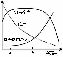 C.稀释率超过b点后,营养物质浓度过高导致细菌死亡率增大,细菌密度降低