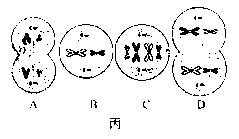 (4)丙图取自 (甲、乙)图所示的生物,若A、B、C、D细胞图来自同一器官,则该器官的名称为 ,图丙中具有同源染色体的细胞有 ,A细胞的名称是 。基因的分离与自由组合发生于图丙中的 细胞所处的时期,图丙所代表生物的各种细胞中最多时染色体组数为 组。