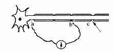 14.取出枪乌贼的粗大神经纤维,进行如下图所示的实验:将电位计的两个微型电极a、b分别置于神经纤维膜外,强刺激c处,电位计指针的偏转情况是