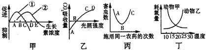 A.农业上常用一定浓度的生长素类似物除去单子叶农作物中的双子叶植物杂草,甲图中①表示单子叶植物,选用的生长素类似物的浓度最好在D点左右
