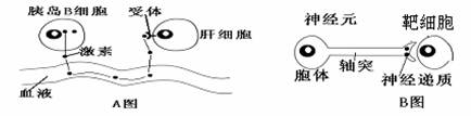 B.B图中的靶细胞如果是A图中的胰岛B细胞,则它受到的刺激是由垂体传递过来的