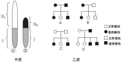 (1)分析甲图,位于Ⅱ1片段上的某基因所控制性状的遗传最可能与乙图的 (填编号)相符,其遗传特点是 。