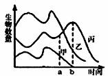 B.a点时丙数量的上升主要是食物的增加