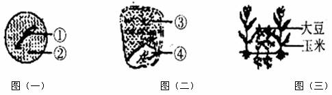 42.玉米(2n=20)是一种重要的农作物,为了提高玉米的产量,科学家在育种和栽培中做了大量的研究。图(一)是人工种子,图(二)是玉米自然种子的纵切面,图(三)是将玉米和大豆间隔种植的示意图。请据图回答:(注③是胚乳、④是胚)