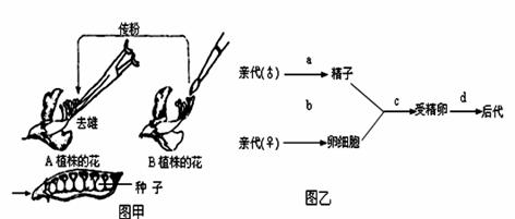 (1)图甲中A植株为黄色豆荚(aa)、绿色子叶(bb)纯种碗豆,B植株为绿色豆荚(AA)黄色子叶(BB)的纯种碗豆,这两对基因独立遗传。经过图示处理,A植株形成有种子的豆荚,其豆荚的颜色是 色,子叶的颜色是 色。第二年将经过处理形成的所有种子播下,在自然条件下,长出的植株所结的碗豆豆荚为黄色的占 ,其种子中胚的基因型是AABb的占总数的 。